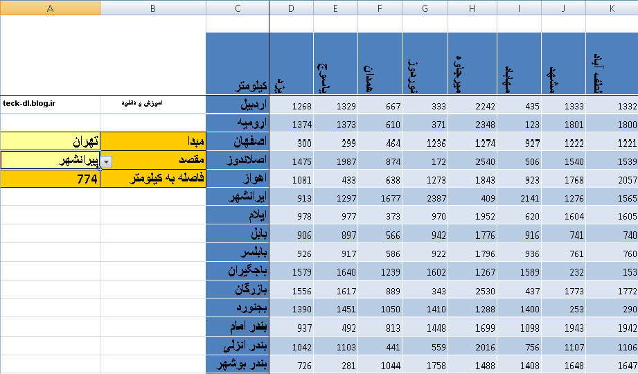 اوضیحات : در این فایل شما میتوانید فاصله بین شهرها را بر حسب کیلومتر با یک جستجوی ساده بدست بیاورید .